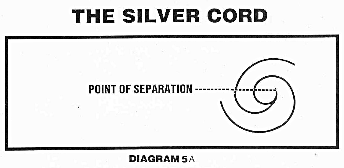 The silver cord snaps at the point where the sixes unite, half remaining with the dense body and the other half with the higher vehicles. From the time the cord snaps the dense body is quite dead.
