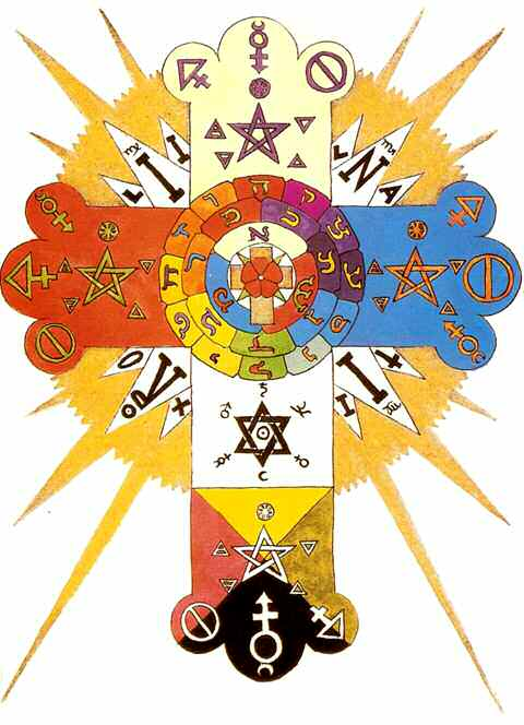 But all things change on this terrestrial sphere, and this applies also to the methods of Initiation and the requirements thereof. Hiram Abiff failed in his great effort to make the molten sea at the time when he was building Solomon's Temple, because he, the son of the fiery Lucifer Spirits, did not know how to blend the element fire with the water poured into his mold by the sons of Seth, the creatures of the water God, Jehovah. At that time he was given a new Hammer and a new Word. The Hammer was in the form of a cross. The Word was written upon a disc, before he was finally slain by his adversaries. And so he slept until as Lazarus, the widow's son of Nain, he was raised by the strong grip of the lion's paw, the Lion of Judah. Then the disc was found, also the new cruciform Hammer, and upon the disc the mystic symbol, the Rose. In these two symbols lie hidden the great secret of life, the blending of water and fire, as symbolized by the earthborn fluidic sap ascending through the stem and calyx of the flower to the fire tinted petals, born in the purity of the Sun, but still guarded by the thorns of the martial Lucifer spirits.