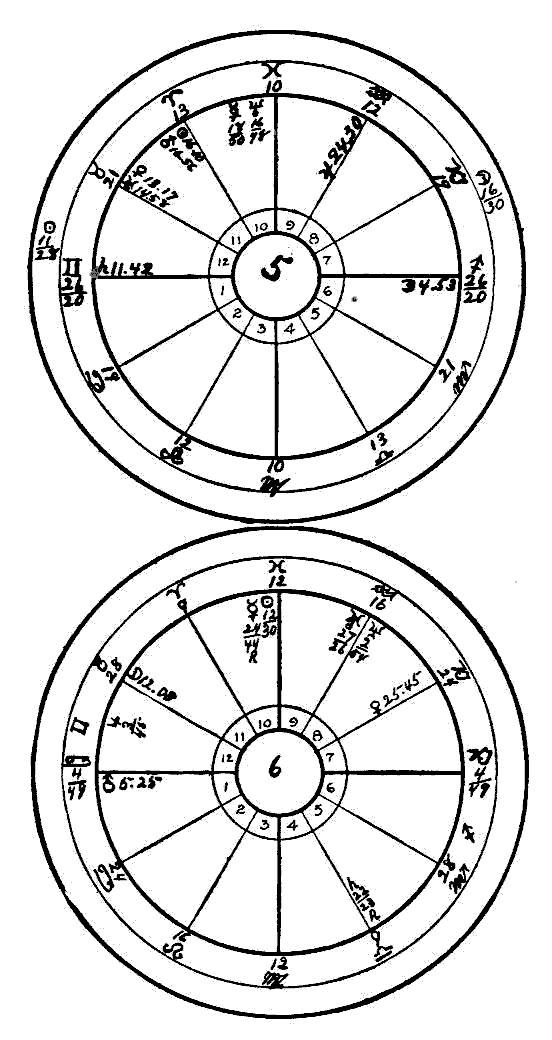 In horoscope No. 5 we see the Moon in the Sixth House, about three degrees from Antares, and Saturn is in the Twelfth House within 4 degrees of an opposition to Antares, about 7 degrees from exact opposition to the Moon; thus his natal influence was minimized. Had the opposition been close or exact, blindness from birth would have been inevitable, but fortunately it was a weak aspect and the vision was not seriously affected until the Sun by progression entered the Twelfth House, passed the opposition to the Moon, then opposition to Antares and arrived at conjunction with Saturn. These points of contact in the horoscope marked crises in the disease of the eyes. Saturn being the afflicter, the nerves and muscles crystallized until sight of one eye was lost and the other eye is almost blind. In November, 1912, the Moon had progressed to the square of the Sun's place at birth. That was the final crisis which vivified the before-mentioned aspects. Neptune makes no aspect to the points of the Zodiac mentioned, hence the spiritual sight is deeply dormant.