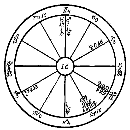 We will now progress the planets from August 16, 1908, which corresponds to their places in the ephemeris on March 12, 1865. By adding the distance which the principal planets move in 5 months, we find that in January 1909 the progressed Sun was in 22-22 of Pisces; the Moon was in 27- 28 of Virgo; Mars was in 21 degrees of Gemini; Jupiter in 27-19 of Sagittarius; Venus in 7-50 of Taurus; Mercury in 17-16 of Pisces.
