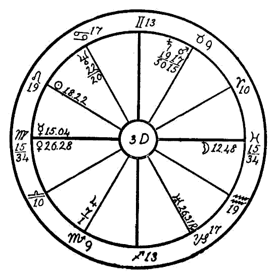As we have no birth hour, the signs are entered on the houses in numerical order so that Aries occupies the first house, Taurus the second, Gemini the third, etc. and the noon positions of the planets are used just as they are given in the ephemeris.