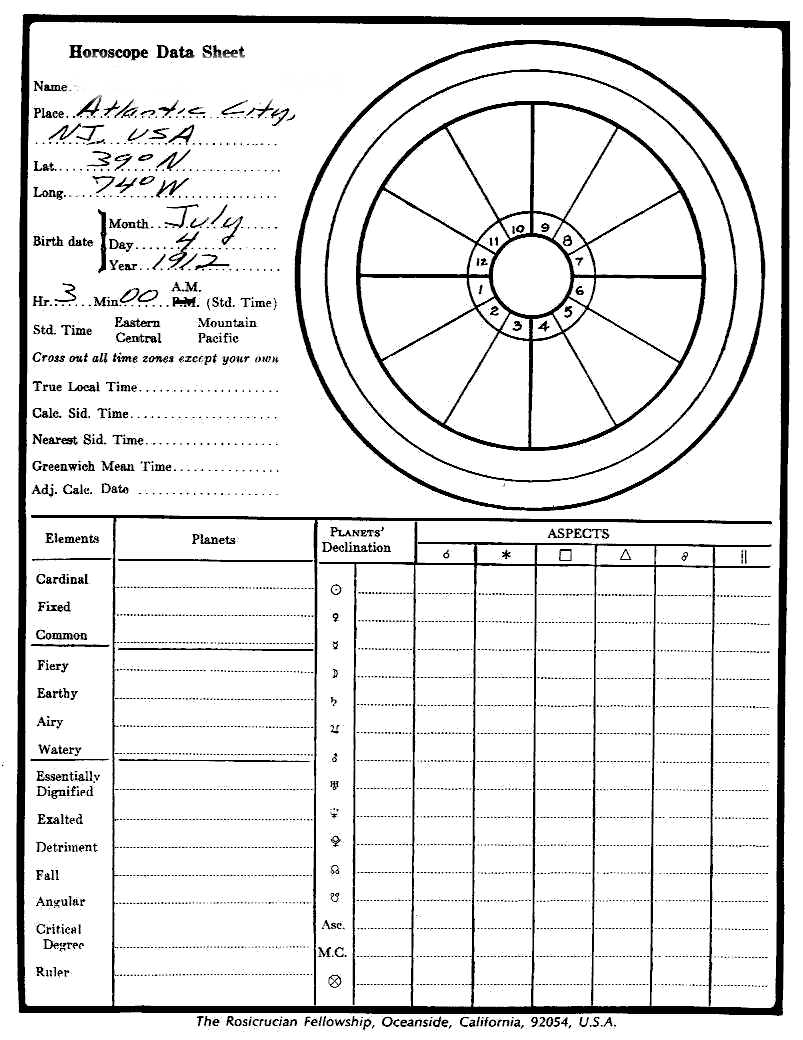 1. When you have studied this Astrology Independent Study Module, please set up the practice horoscope below, [Birth Place: Atlantic City, NJ, USA; Lat.: 39 deg. N.; Long.: 74 deg. W.; Birth Date: July 4, 1912; Birth Time: 3:00 A.M.] and return it to us. Upon receipt of this we will send you the next Astrology Independent Study Module. [optional]
