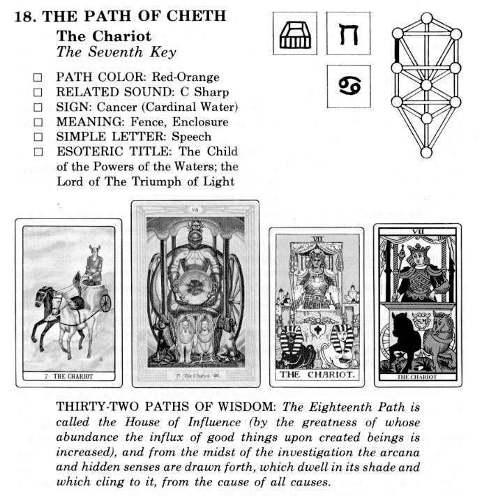 The chariot is drawn by two sphinxes, one white, the other black — symbol of the positive and negative forces of nature over which he has gained mastery. There is a starry canopy above his head, supported by four columns. These four columns typify the four elements on which all forces of nature depend: Fire, Air, Water, Earth.