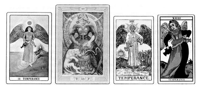 The fourteenth Arcanum shows us a handsome youth, illuminated by the great yellow sun which shines above him. In his hands he holds two urns, one gold the other silver; and from the gold urn he pours a rare electric and magnetic fluid into the silver urn. He pours this elixir most carefully, so that not a drop of the precious liquid is lost.