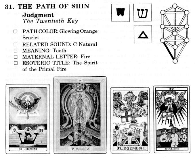 The twentieth Arcanum depicts a celestial being blowing a great trumpet, whereupon a sarcophagus opens and the mummies of a man, woman and child emerge. In Christian tradition it is the Angel Gabriel who is the Angel with the Trumpet who calls the dead from the grave in the day of the Great Judgment. The time is the end of this world when all must stand before the Judgment Seat of God. To the esotericist, however, this Arcanum has a far more wonderful meaning. It is concerned with a marvelous expansion of consciousness with which the pioneer will be endowed. For him there will be no interval of unconsciousness between sleeping and waking. He will be able to pass easily from inner-plane awareness in his work as an Invisible Helper during the hours of sleep to outer-plane awareness in which he is a Helper Visible to all. He will know from first-hand knowledge that there is no death and that that which is mistakenly termed death is but a passing into larger and wider spheres of service and creative activity. It has been truly said that "the dead help us to live."