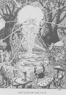 As they looked, however, the mist cleared and a shining silver gate was seen. The tall pillars on either side were two silver candles and the gate between was a circle of silver; in the center of this was a gigantic crab holding between its claws a crescent moon, which shone as the real Moon. On its shell were two queer signs like notes of music, side by side.