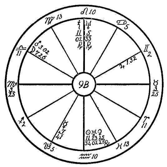 The second horoscope is that of a young boy born with the dread disease with which the woman in case No. 8D was afflicted. The boy's poor little body at birth was covered with sores, and in the early part of November of the birth year this poor soul passed out under great suffering.