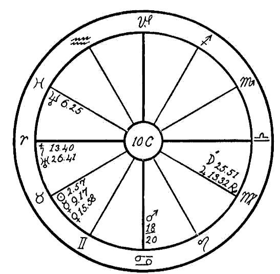 In the beginning of the year 1923 the progressed Moon was passing through the sign of Virgo and made a square to the radical Mars in Sagittarius. This disturbed the metabolism of the digestive tract, which on account of the resulting inflammation was unable to furnish the blood with the proper amount of mineral salts. This combined with the disturbed solar force caused by an afflicted Sun deprived the bones and the muscles of their —