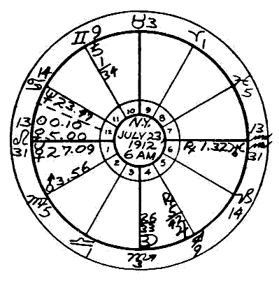 In the first five self-study modules you learned how to find the Sidereal Time of a birth and to place the proper sign and degree of the zodiac upon each of the twelve houses. The last three Astrology Independent Study Modules have been devoted to calculation of the planets' places in the zodiac, and now the time has come to enter them in the horoscope. When they have been entered in their proper houses, the horoscope is complete. This will, therefore, be the subject of our present Astrology Independent Study Module.