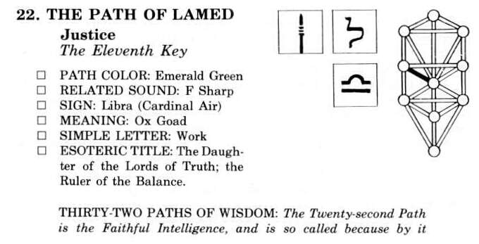 The Eight Arcanum shows a maiden holding an uplifted sword, symbol of Truth. In the other hand she holds a pair of scales. One of the most dramatic episodes recounted in the Egyptian Book of the Dead is that of the weighing of the heart when the soul comes to Judgment soon after death. The weighing of the heart determines his place, whether it is to be in the upper or lower abodes, with gods or demons.