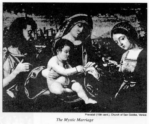 proffering her hand to be ringed by the infant Christ (Jesus)
