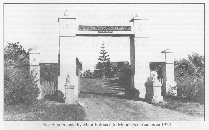Planted in Mt. Ecclesia's early days, as near as we can gather around 1915, photographs indicate that from the outset the tree seemed "a natural" for bearing Christmas lights. In grand view, it stands forty yards inside the Fellowship archway, each of whose two piers is flanked by a regal sejant lion — a fitting tribute to the Fellowship's founder, who was a triple Leo! The tree rises to a height of one hundred and twenty feet.