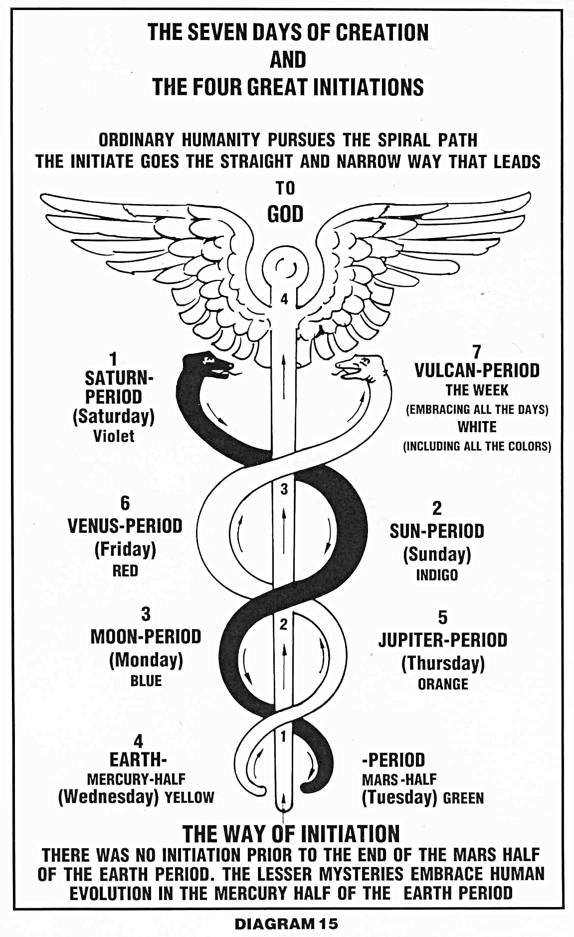 This pilgrimage of Involution and Evolution, including the "short cut" of Initiation, is embodied in the Caduceus, or "Staff of Mercury" (see Diagram 15 below), so called because this esoteric symbol indicates The Path of Initiation, which has been open to man only since the beginning of the Mercury half of the Earth Period. Some of the Lesser Mysteries were given to the earlier Lemurians and Atlanteans, but not the Four Great Initiations.