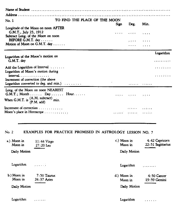 This finishes our calculation of the Sun in connection with this horoscope; we shall later explain how to enter it in the chart. In the next Astrology Independent Study Module we shall proceed to figure the Moon's place.