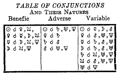 Conjunctions in the "variable" column are sometimes benefic and sometimes adverse. For further information regarding them see Simplified Scientific Astrology.