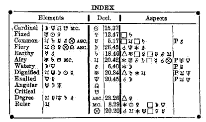 All the information which we have worked out above regarding the aspects, dignities, exaltations, angles, triplicities, quadruplicities, and rulerships is now to be collected and placed in a diagram or index. Below, we can see this index made out for the horoscope under consideration. From it we see that Neptune and the Moon are in cardinal signs; the Sun, Venus and Uranus are in fixed signs; Saturn, Mars, Mercury, and Jupiter are in common signs. Also, the Sun, Venus, and Jupiter are in fiery signs; Mars and Mercury are in earthy signs; Saturn and Uranus are in airy signs; Neptune and the Moon are in watery signs.
