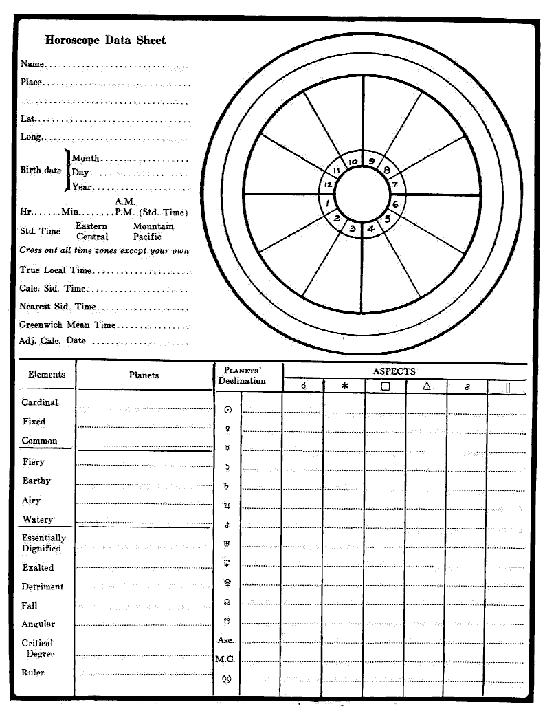 In Astrology Independent Study Module No. 12, you completed the setting up of the horoscope for August 10, 1912, 4:00 P.M., New York City. We will now consider the subject of the aspects between the planets in this horoscope.