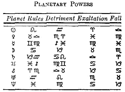 Students should not get the idea from the above that the detriments and falls of the planets invalidate or destroy their influence. A planet is a driving force no matter in what sign it is located, and that force will operate regardless of all other considerations. Planets that are in the signs of their detriment and fall are a little handicapped in their activities, and therefore cannot get quite as good results as in more favorable signs, but they will always assert themselves to some degree wherever they are placed. The following table shows the rulerships, exaltations, detriments, and falls of all the planets.