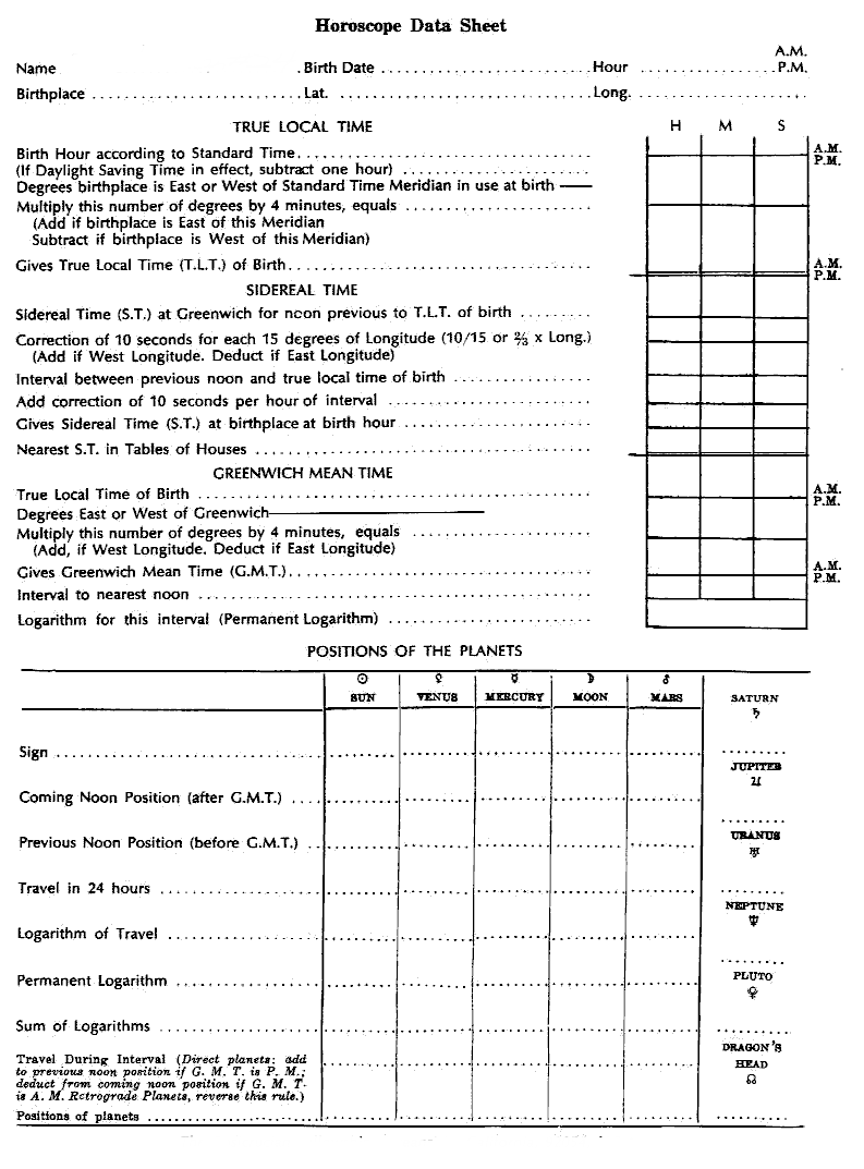 To complete the "symmetricalness" we now add the symbols of the zodiacal signs outside the wheel, starting with Aries on the cusp of the first house and continuing around the wheel in regular sequence. The result is the Great Astrological Mandala — the abstraction from which all horoscopes are derived. This addition of the zodiacal signs integrates vibration with structure. We now recognize that the application of thirty degrees of each sign to the thirty degrees of each house represents a charging of structure with vibratory life just as a house becomes a home when it is used as a habitation by people and a violin becomes a musical instrument when it is played.