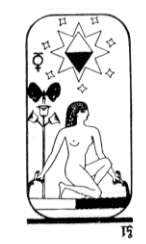 Here we see a young maiden kneeling with one foot on the sea and one on land. In each hand she holds an urn from which she is pouring upon land and sea simultaneously the precious fluid of love and kindness. She typifies the New Age in which mercy and loving kindness will prevail in all the earth. Beside her stands a plant having three lotus blossoms, which represent three plane's — physical, mental and spiritual-and also man's threefold personality wherein the physical and mental are being lifted and united with the spirit. Above the flowers hovers a beautiful butterfly — a perfect symbol of transmutation. Over the girl's head shines a great eight-pointed star, in the center of which is a double triangle, the upper one White, pointing toward heaven, the lower Black, pointing toward earth. The message of this double triangle is expressed in the occult maxim, "As above, so below," a promise that earth will one day reflect the glories of heaven.