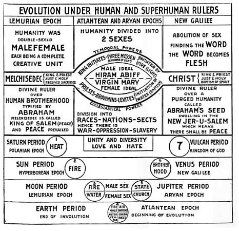 To understand the mystery of Melchisedec we must revert to the earlier epochs of man's stay upon the earth during the age called the Hyperborean Epoch. The earth was then in an extremely heated condition. Man in the making was then double sexed, male-female, like so many of our present plants, and he also resembled the plants in being inert and lacking in desire and aspirations. At that time man was the tractable ward of the Divine Hierarchs who guided him physically, these being darkly referred to in the Bible as "Kings of Edom." Later, during the Lemurian Epoch, when the body of man had crystallized and condensed somewhat more, mankind was divided into sexes physically. But as the consciousness of man was still focused in the spiritual world they were unconscious of the physical act of generation, as we are now of digestion; neither did they know birth or death and were in fact totally unaware of the possession of a physical vehicle until in time they sensed it during the generative process; it was then said that "Adam knew Eve." At that time Lucifer Spirits, fallen Angels and inhabitants of the warlike planet Mars, taught them how to eat of the Tree of Knowledge, which is the symbolical name for the generative act. Thus by degrees their eyes were opened and they became aware of the physical world, but lost touch with the spiritual and the Guardian Angels who had previously been their benevolent guides. Only a few of the most spiritual among them retained their higher vision and communion with the Divine Hierarchs. These were then known as prophets, who acted as messengers between the invisible divine leaders and their respective peoples. But in time mankind desired to select its own leaders and demanded visible kings; at least we know that the Israelites repudiated the divine ruler ship and demanded a king, and thus Saul was appointed. Then the dual office of Ruler and Priest, including temporal and spiritual leadership, was also divided, for no man sufficiently versed in worldly matters to fill the office of king efficiently, had been found holy enough to also undertake the spiritual leadership of his brethren, and vice versa. A true priest, able to lead his flock spiritually, cannot also beneficiently dominate their physical fortunes as ruler of a temporal domain. For as statecraft, in its highest phase, aims to rule the masses with an eye single to their physical welfare, and priestcraft, benevolently exercised, seeks to guide them solely for the soul's progress, so conflict must of necessity follow this separation, even though both the spiritual and temporal rulers be actuated by the highest and most unselfish motives. Melchisedec was the symbolical name of the divine Hierarchs who filled the dual office of king and priest; in the guidance of their double-sexed charges and while they reigned there was peace on earth, but as soon as the offices of king and priest were divorced and the sexes divided, it is not surprising for the reasons given above that the peaceful reign of Melchisedec has been followed by an age of war and strife, such strife as has been experienced during the present dispensation. Formerly the unifying factors of a dual office in the ruler and the double sex of his people precluded the clashing of interests which now obtains, and which will continue until another divine ruler shall present himself to embody within in his own person the qualifications of the dual office of king and priest after the order of Melchisedec, and until sex generation be abolished. In this connection it is significant that the Bible narrative begins in the Garden of Eden, where mankind were male-female and innocent; then in the next chapter we are told of the division of sexes, the transgression of the command not to eat of the Tree of Knowledge, and the infliction of the penalty — painful parturition and swift death. From then on the Old Testament tells of war, struggle and strife and in the last chapter makes the prophecy that there shall a Sun of righteousness arise with healing in his wings. Then the New Testament opens with an account of the birth of Christ, who proclaimed a kingdom of heaven which is to be established. He is later called King and Priest after the order of Melchisedec, uniting within himself the dual office. It is also said that in heaven there will be neither marrying nor giving in marriage, for the soma psuchicon, or soul-body, which Paul tells us is the vehicle we shall use in the kingdom of heaven (First Corinthians, fifteenth chapter), is not liable to death and decay. Thus there will be no death, and birth of bodies like those generated in wedlock would be superfluous, for Paul tells us that flesh and blood cannot inherit the kingdom of God. Hence marriage will be unnecessary, the clashing of interests due to the lust of sex and the love of power will then disappear and the love of souls will be hallowed by the spirit of peace.