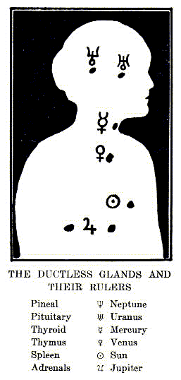 "Science is gradually learning the truths previously taught by the esoteric science and their attention is being more and more directed to the ductless (endocrine) glands which will give them the solution to many mysteries, but they do not seem to be aware as yet that there is a physical connection between the pituitary body, the principal organ of assimilation and therefore of growth, and the adrenals which eliminate the waste and assimilate the proteins. These are also physically connected both with the spleen and the thymus and thyroid glands. It is significant in this connection, from the astrological point of view, that the pituitary body is ruled by Uranus which is the octave of Venus, the ruler of the solar plexus where the seed atom of the vital body is located. Thus Venus keeps the gate of the vital fluid coming direct from the Sun through the spleen, and Uranus is warder of the gate where enters the physical food, and it is the blending of these two streams which produces the latent power stored up in our vital body until converted to dynamic energy by the martial desire nature."