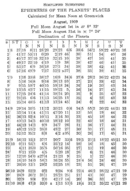 They are found in the ephemeris for the current year. That is to say, if you want to know what planets transit the different houses of your horoscope in 1916, you can find them only in the ephemeris for that year. The 'radical' and 'progressed' planets are all in the ephemeris for the year you were born, but the 'transits' for 1920, for instance, can only be found in the ephemeris for 1920.
