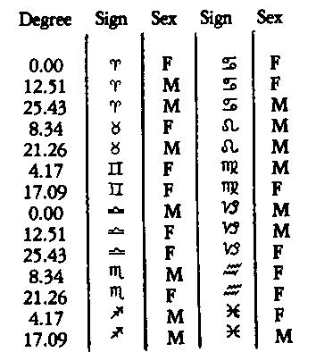 The law of sex is based upon the Hindu subdivision of the zodiac into twenty-eight mansions or "asterisms" of 12 6-7 degrees each, which gives the following: