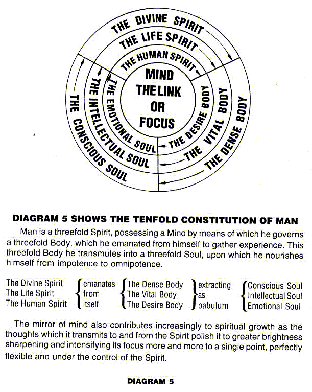 (4) The Mind, which is a mirror, reflecting the outer world and enabling the Ego to transmit its commands as thought and word. It is the link between the Spirit and its bodies. At the present time it is but an unformed cloud, but will eventually be as well organized as man's other bodies.