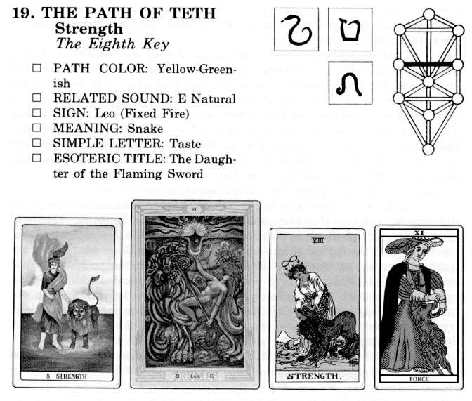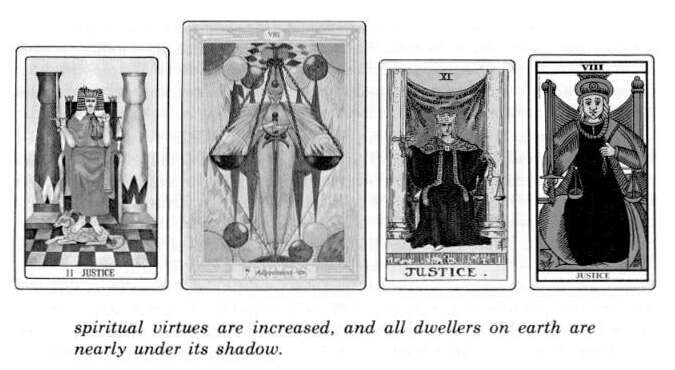 The Eight Arcanum shows a maiden holding an uplifted sword, symbol of Truth. In the other hand she holds a pair of scales. One of the most dramatic episodes recounted in the Egyptian Book of the Dead is that of the weighing of the heart when the soul comes to Judgment soon after death. The weighing of the heart determines his place, whether it is to be in the upper or lower abodes, with gods or demons.