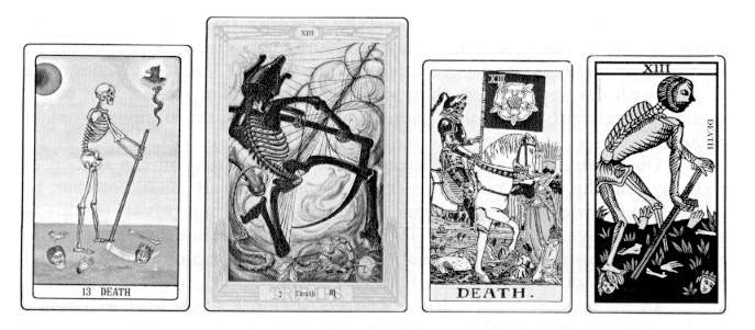 The figure of the skeleton in this Arcanum represents the fleetingness of all earthly things; but behind the skeleton, across the horizon, arches the great rainbow, symbol of hope and of the promise that man's spirit is eternal.