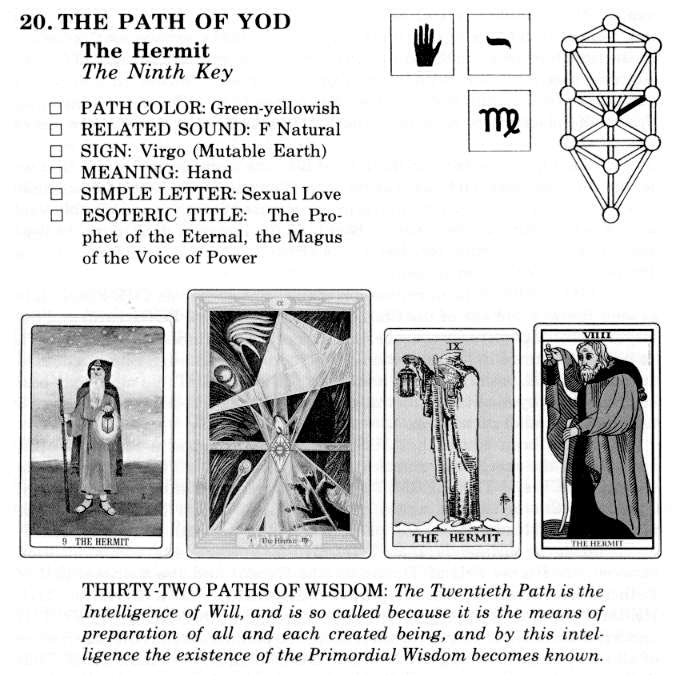 In another reading the "Old Man of the Mysteries" represents the Wanderer through the world, the Virgin Spirit on its pilgrimage through matter with its manifold illusions, as shown by the pilgrim's staff upon which he leans while walking, and by the manner in which he holds his cloak to protect the flame of his lamp. He is sometimes. called the Hermit, and as such he portrays the biblical characters of Elijah and John the Baptist. Elijah is the Great Light, the Hierophant, of esoteric Judaism. The kabbalists teach that he is the reincarnation of Moses. According to the Christian kabbalist, Elijah was reborn as John the Baptist, as shown in the words of the Christ, "This is Elias." In John the Baptist the Light of the ancient Mysteries of the Holy Land passes over into the New Mysteries of the Dispensation of the Kingdom of Christ.