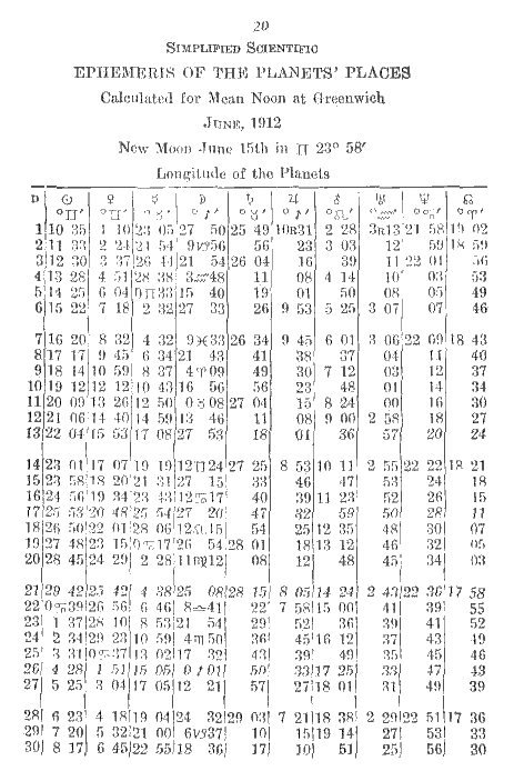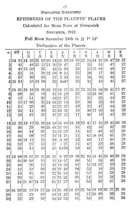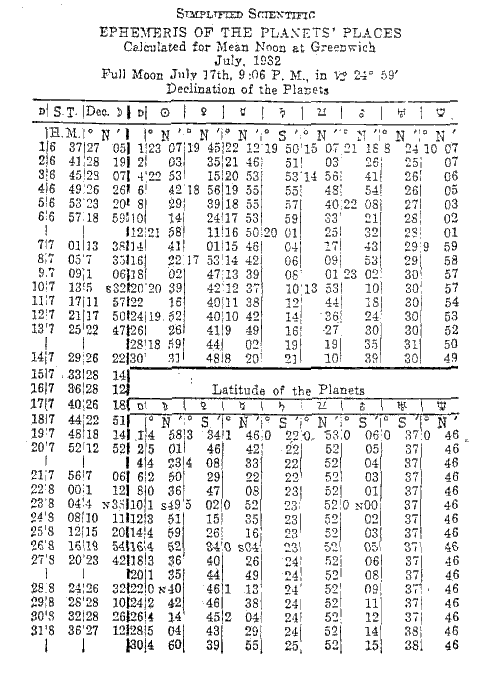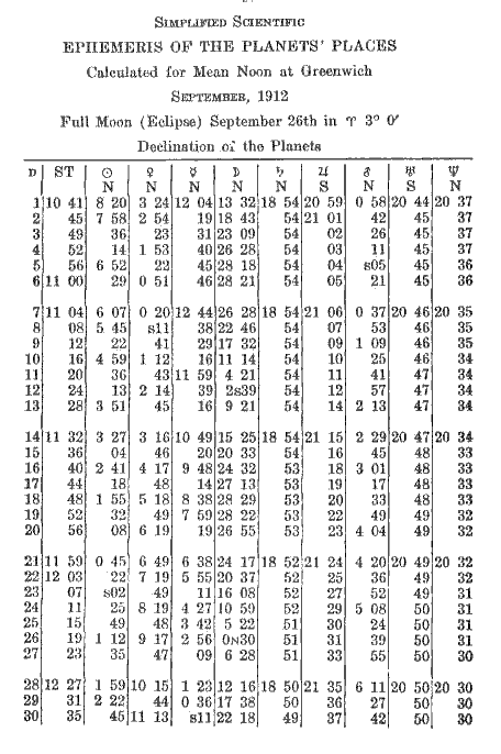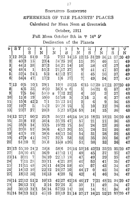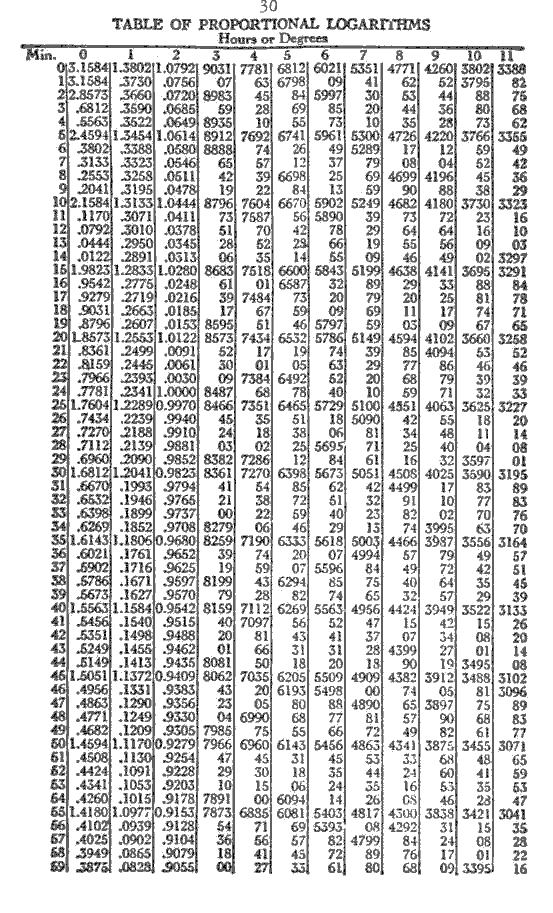 The logarithm for 5.08 is 6698. This added to the permanent log., 6812, equals 1.3510. This converted into time equals 1° 4'. Subtract from 20.33 and the result is 19.29, declination of Moon. An orb of 1 1/2 degrees is allowed for parallels.