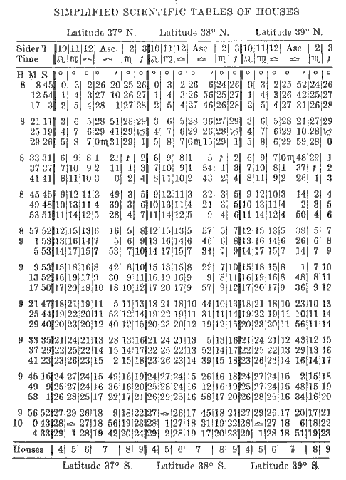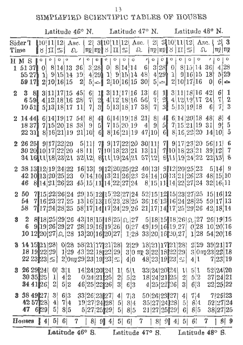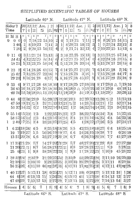 To erect a chart for South latitude simply add 12 hours to the Sidereal Time at birth. First proceed according to instructions given in Simplified Scientific Astrology and Study Modules 1 to 5 of the Astrology Course. Then to the calculated Sidereal Time add 12 hours; if the sum is more than 24, subtract 24 hours and the remainder will be the Sidereal Time at birth, for a birth occurring in South latitude. At the bottom of the page in the Tables of Houses you will see the word Houses followed by 4, 5, 6, 7, 8, 9; these are the houses you use, that is, you start with the 4th house instead of the 10th as usual. For example, if Cancer is on the 10th house, then in a chart for South latitude it will be on the 4th and Capricorn will be on the 10th house.