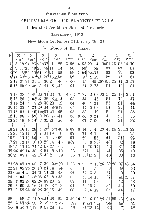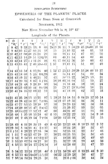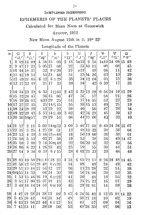 Let us now complicate this a little. Suppose the moon was in 26° — 29' — 47" of Aries and the following noon would be in Taurus, 8° — 15' — 38". That is as hard as any problem you will likely to meet. here it is: