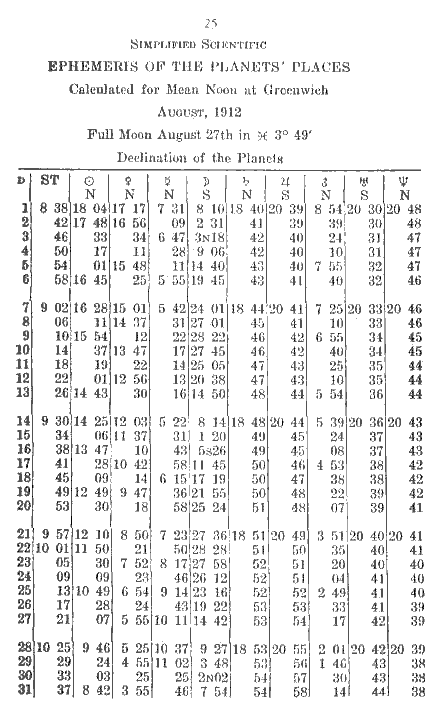 The declination of the planets should be copied directly from the ephemeris for the day having noon nearest G.M.T., with the exception of the Moon, which requires a logarithmic correction in accordance with the G.M.T. Correction is made by the same method used in obtaining the Moon's longitude. if the declination of the Moon be less on the coming day than on previous day, treat as a retrograde planet.